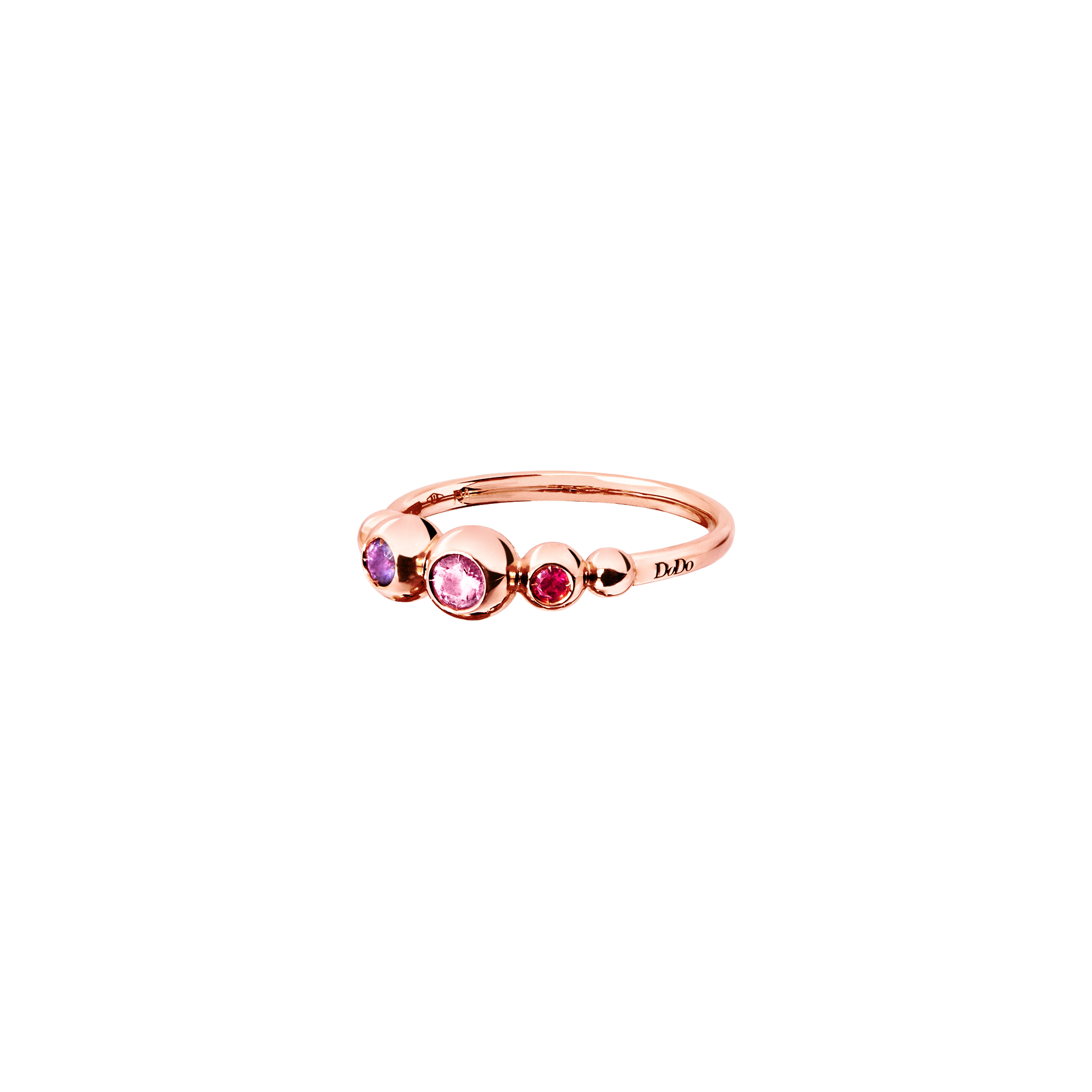 Anello Bollicine in oro rosa 9K con 1 zaffiro rosa (ct 0.13), 1 rubino (ct 0.04) e 1 ametista (ct 0.05).