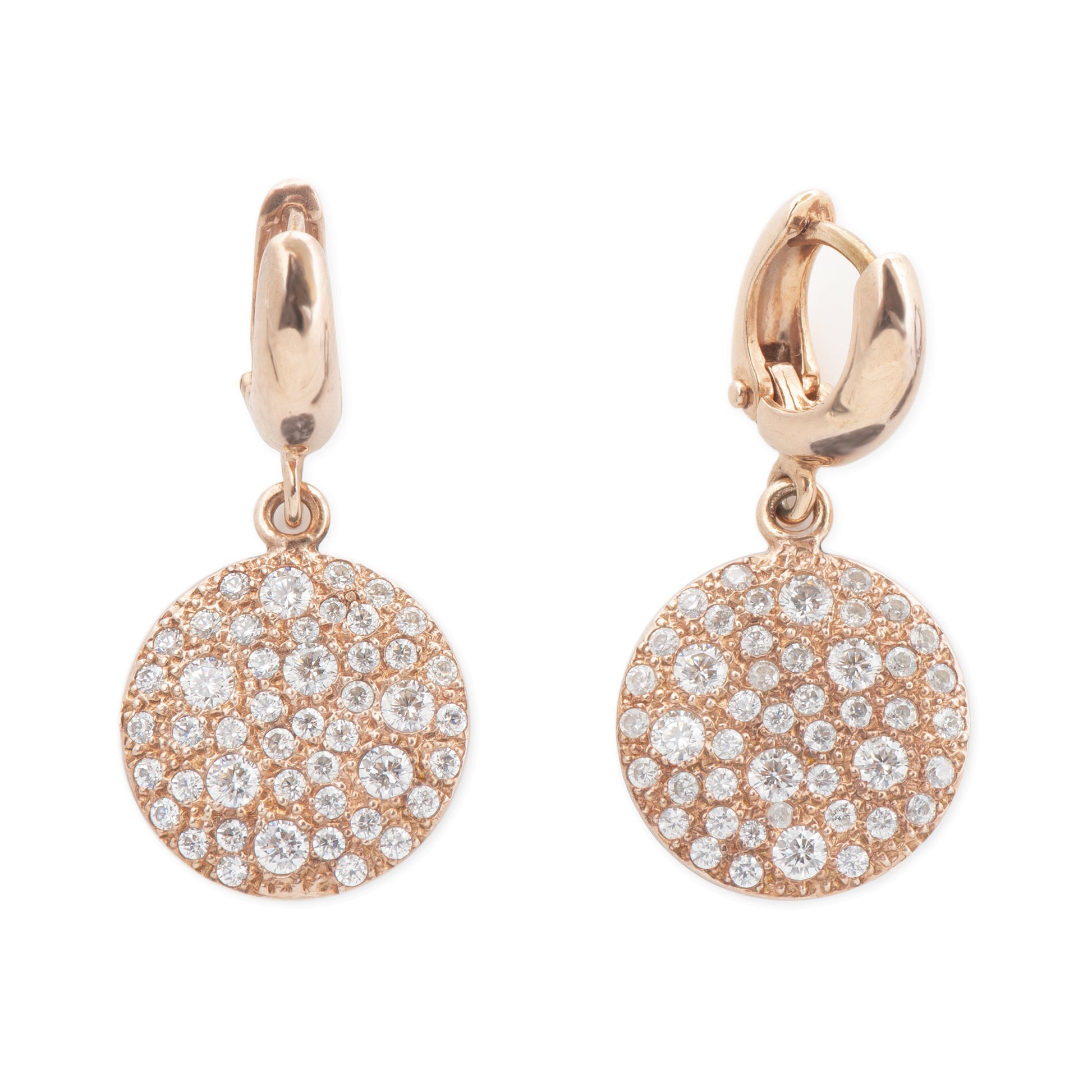Orecchini cerchio in argento 925 rosè e pendente tondo medio 16 mm con zirconi bianchi.