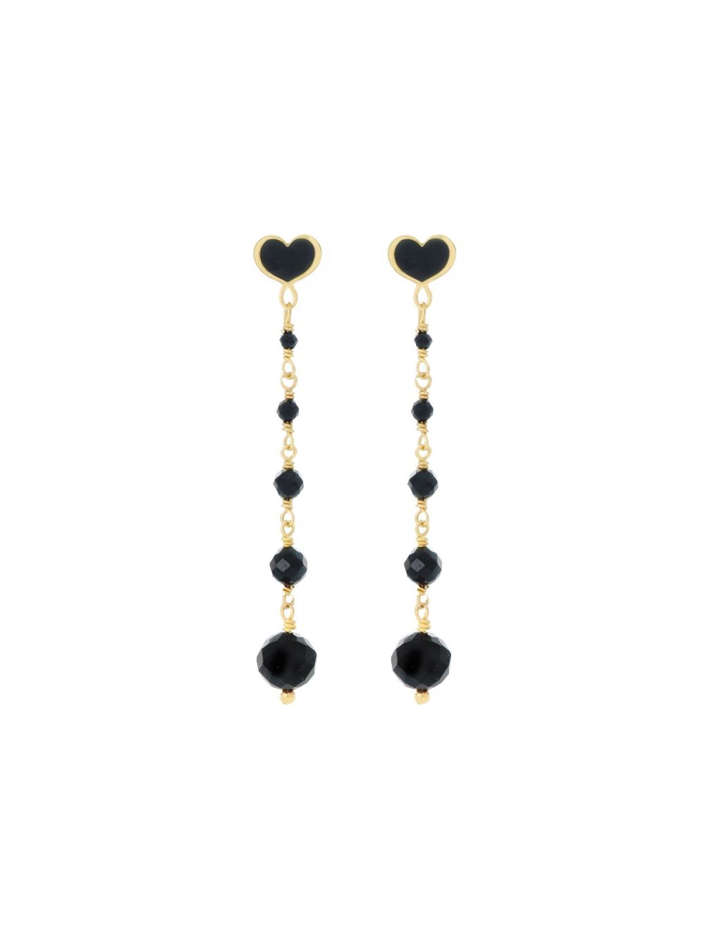 Orecchini a lobo in argento 925 con galvanica oro giallo, cuore smaltato in nero e catena rosario con cinque pietre di Spinello sfaccettato pendente in diverse dimensioni.