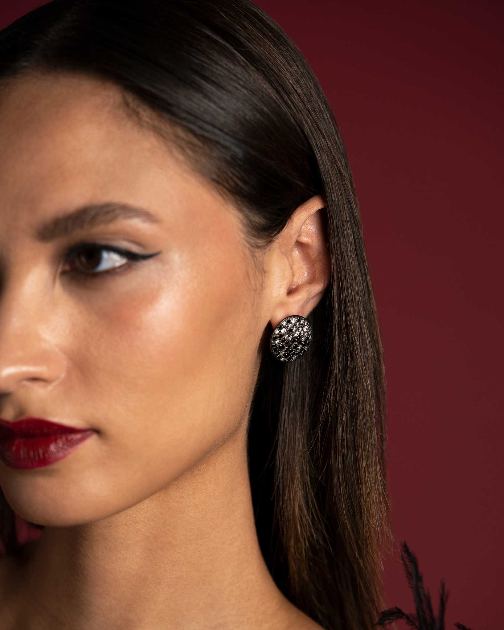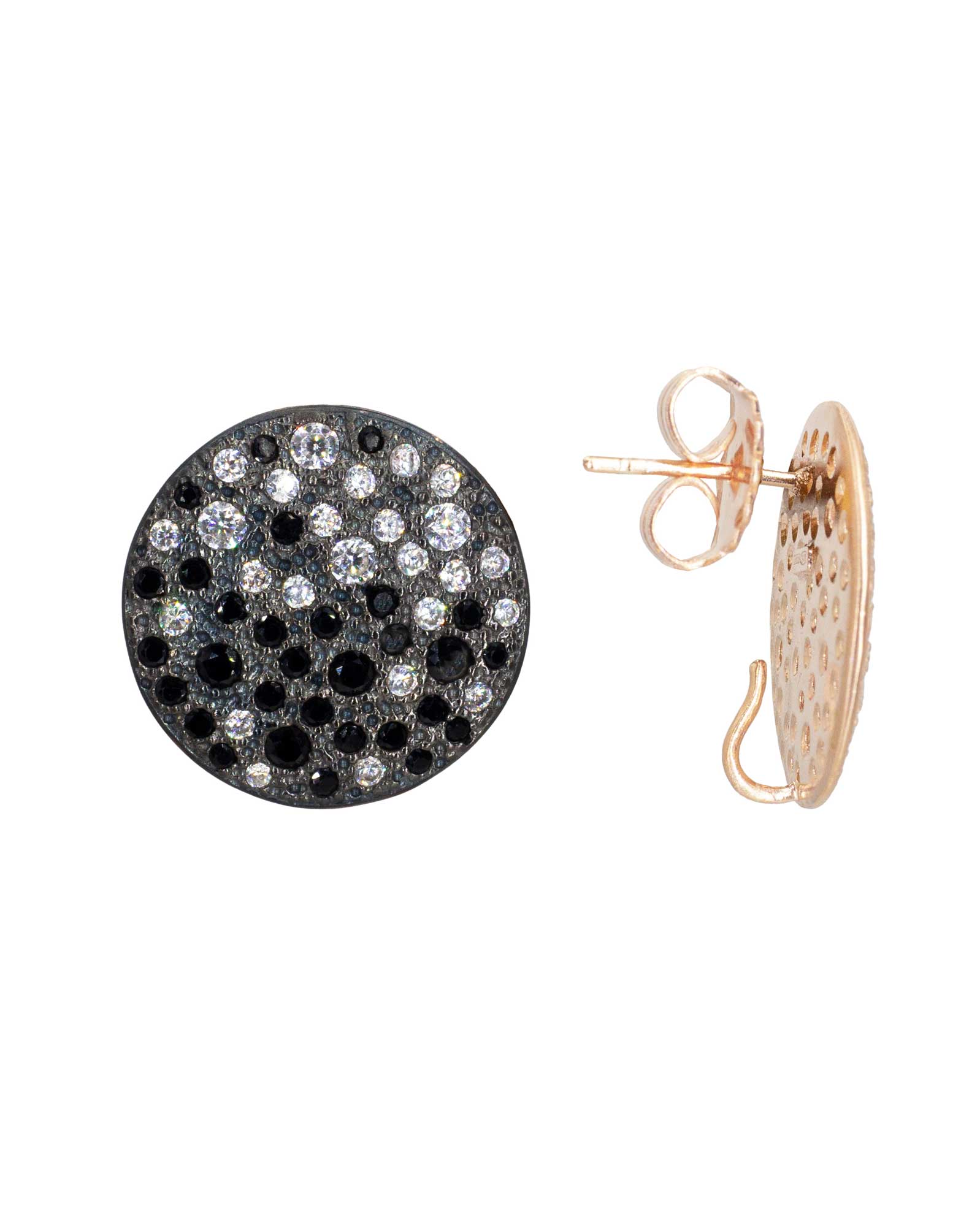 Orecchini in argento 925 rosè, tondo grande 20 mm con zirconi neri e bianchi.