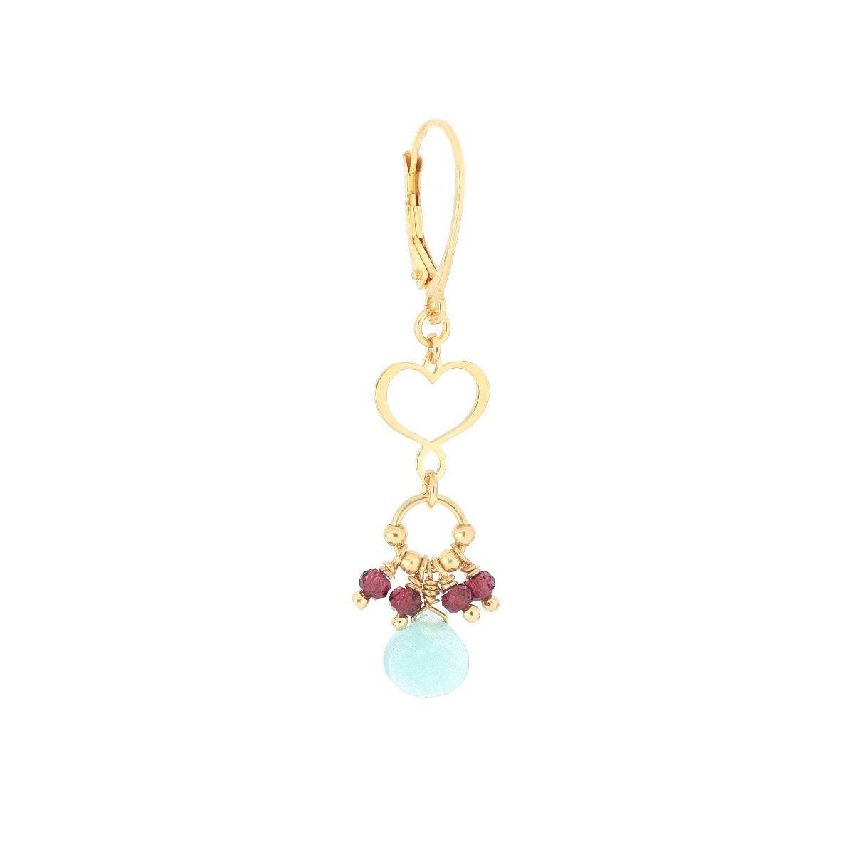 Orecchino singolo in argento 925 con galvanica oro giallo, pietre di Granato e una goccia di Amazzonite celeste