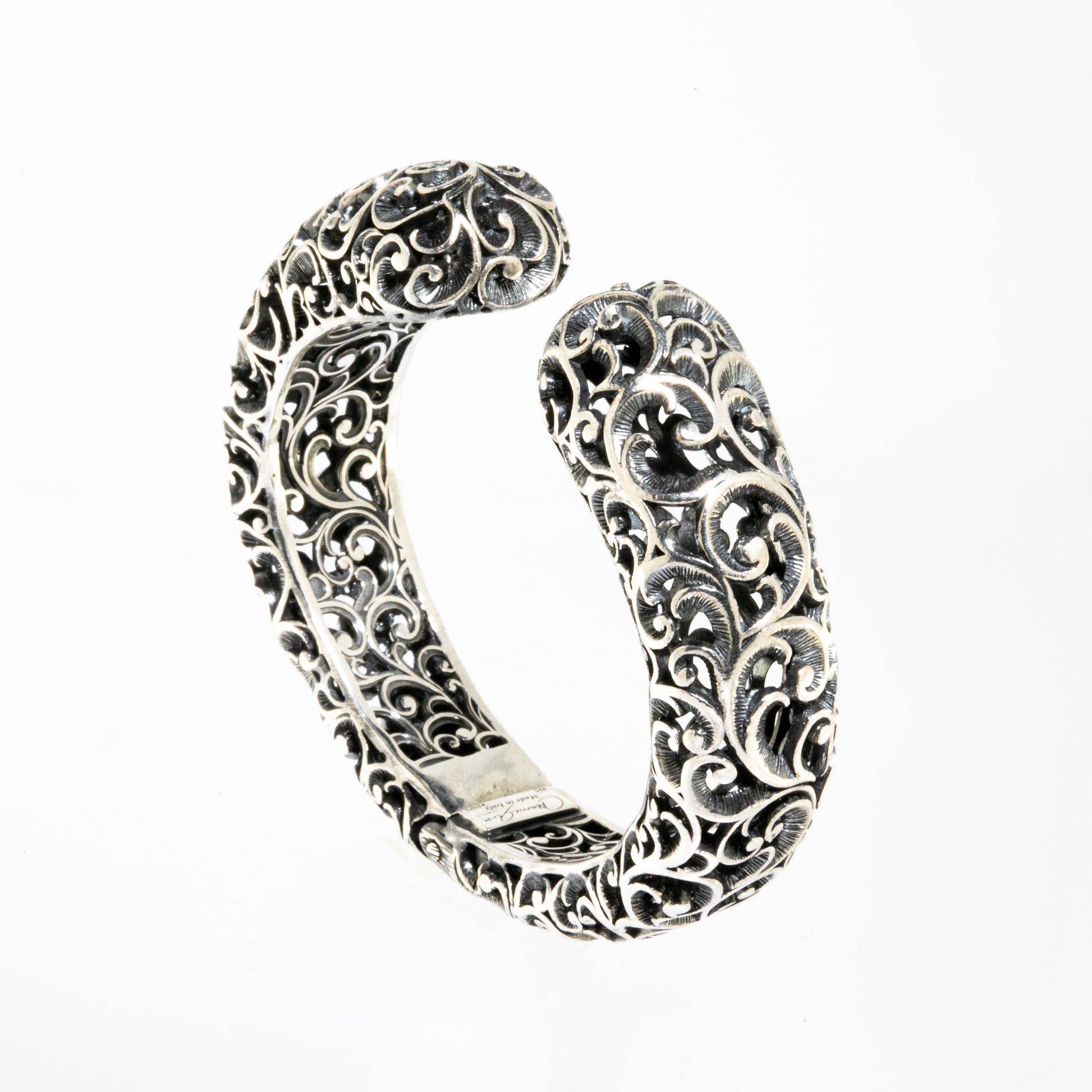 Bracciale contrariè large rigido in argento 925 brunito con apertura centrale nascosta.