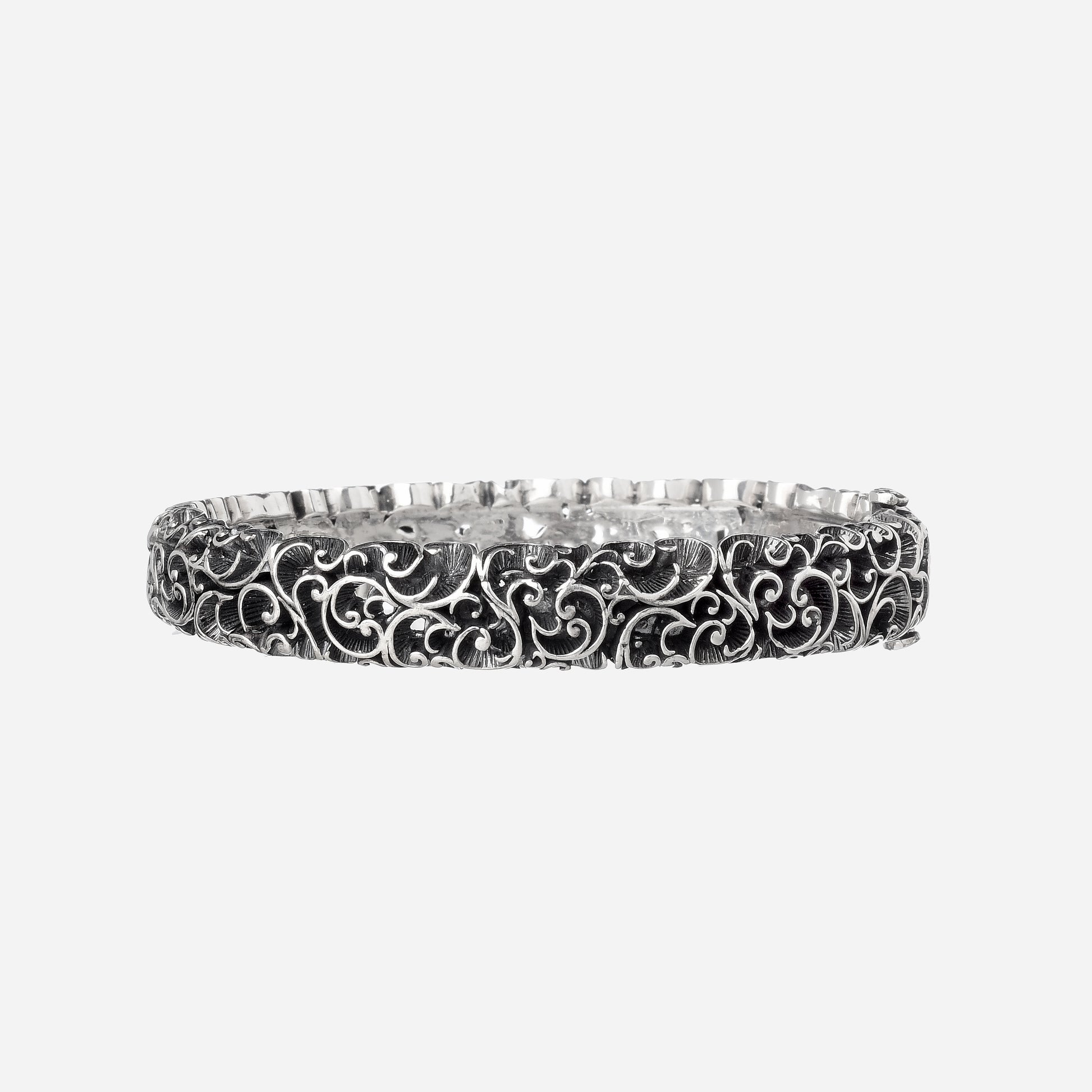 Bracciale a manetta stretta in argento 925 brunito con chiusura a scomparsa.