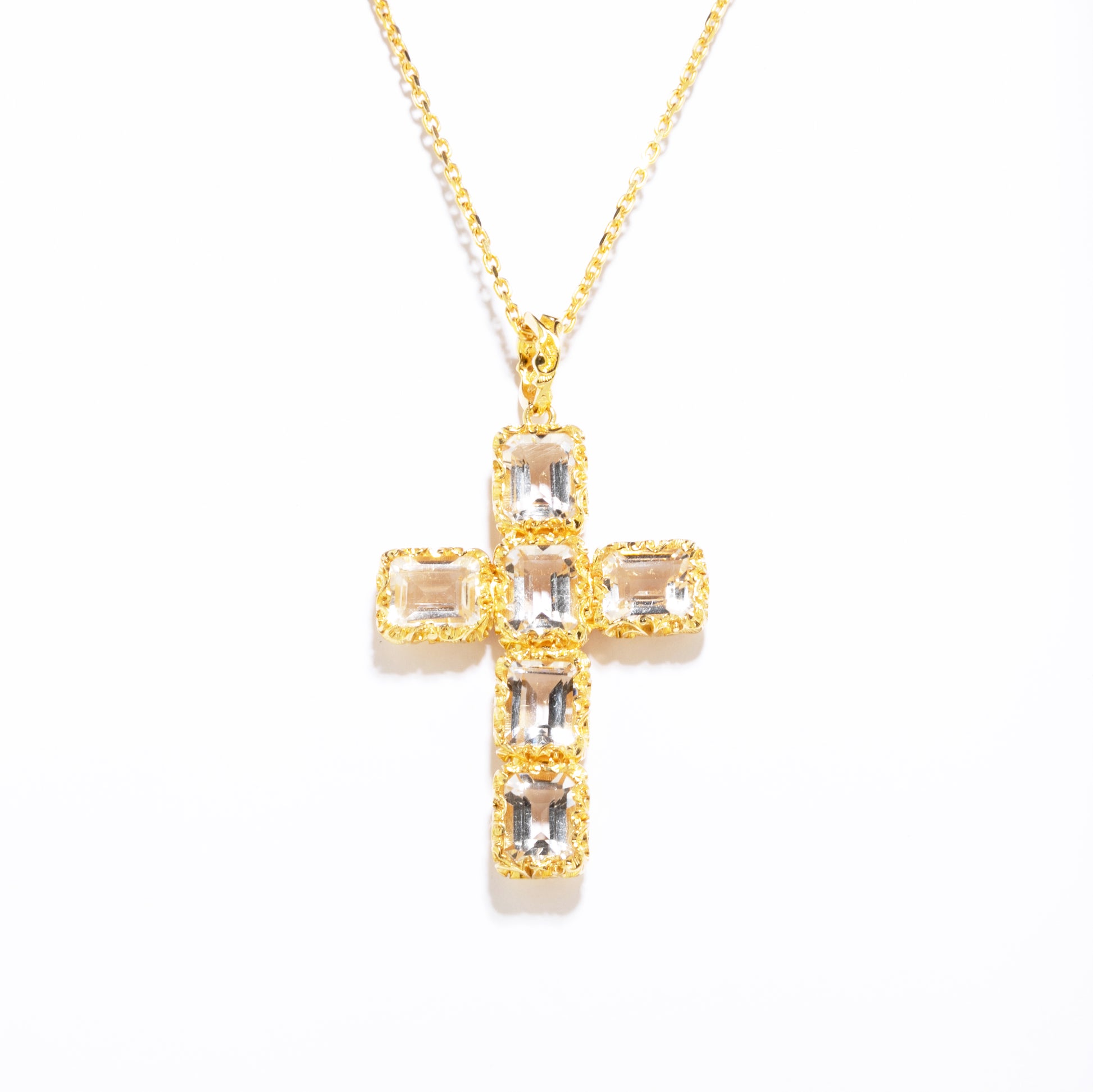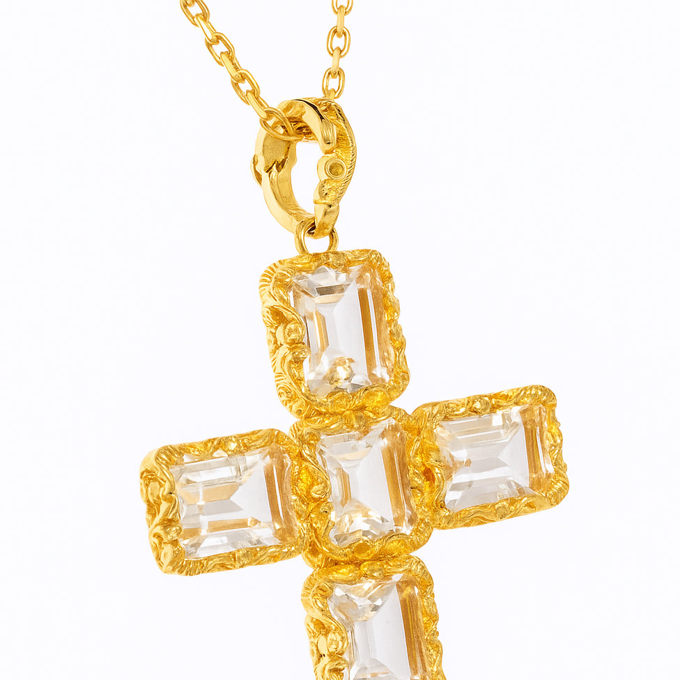 Collana lunga in argento 925 placcato oro 18Kt e croce pendente con 6 pietre Cristallo di Rocca 8x10 mm.