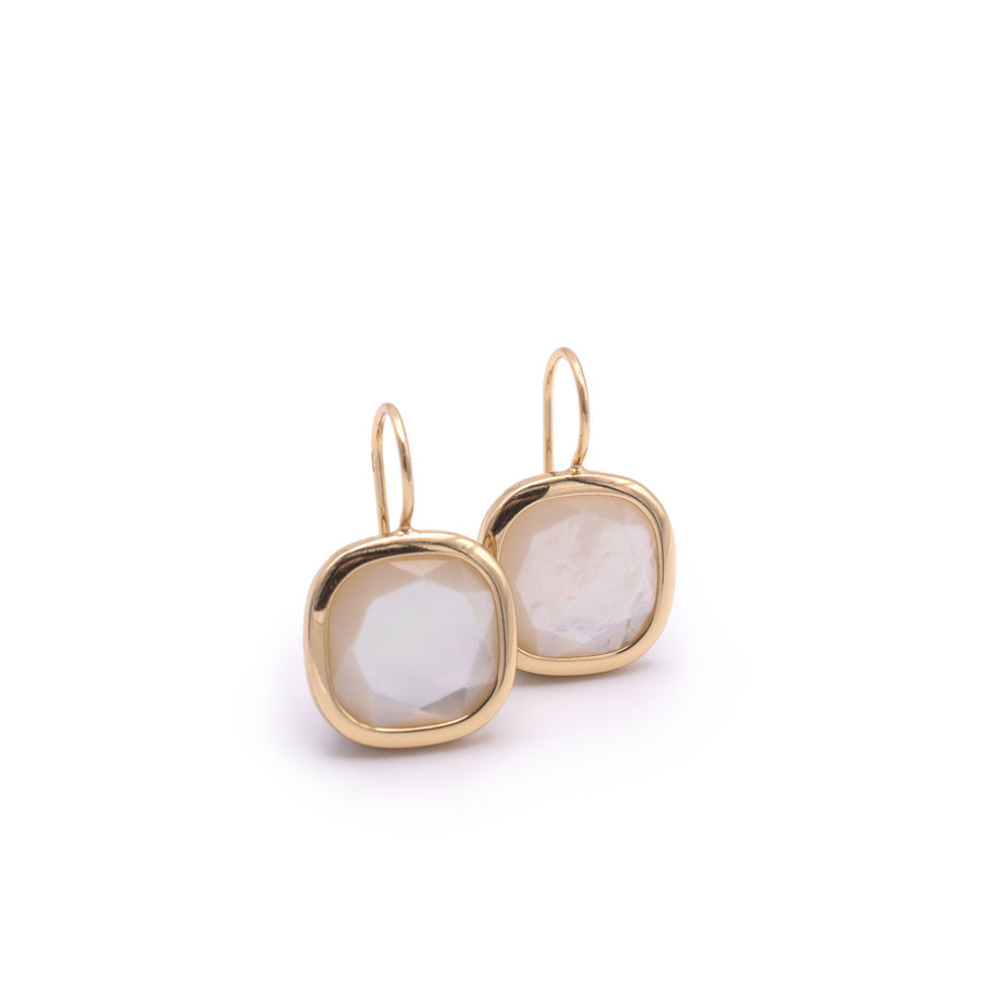 Orecchini monachella in argento 925 placcato oro giallo 23kt e madreperla quadrata 16x16 mm.